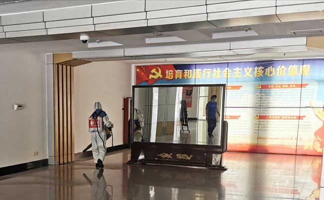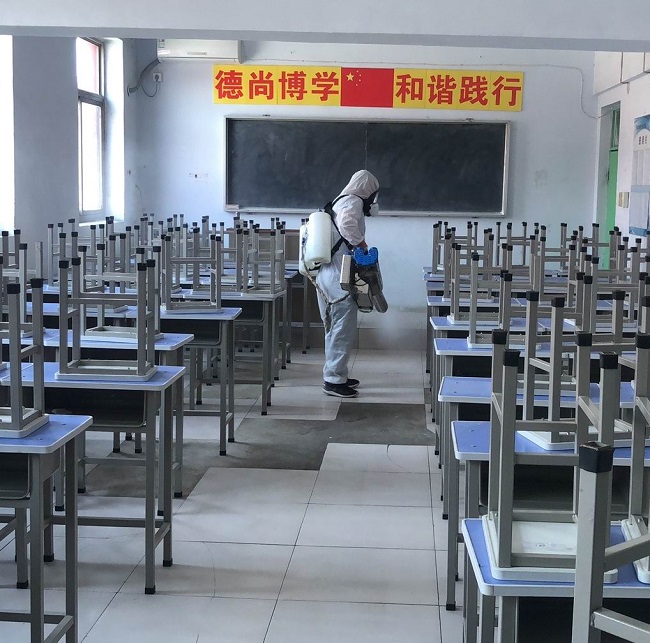 6月3日上午9点,在王建辉队长的带领下,8名蓝天救援队队员身穿防护服,手持消毒机,严格按照消毒标准规范进行操作,对我校南、北两个校区的教室、办公室、会议室、楼道、洗手间、餐厅、学生宿舍、学生浴室等进行全面细致的消毒。经过近两个小时的工作,蓝天救援队共为我校消杀两万平方米,他们采用“地毯式”的消杀方式,不遗漏每一个角落,为我校筑牢校园安全防疫的“防火墙”,为复学复课奠定了良好的基础。