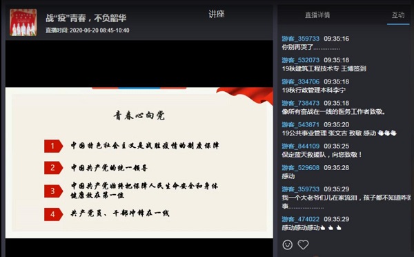为了做好思想政治教育工作,鼓励学员积极应对疫情,加强思政课教学,6月20日上午,我校开放教育处特邀请河北省第六批(保定市第五批)援鄂医疗队队员、保定市妇幼保健院新生儿科副护士长、我校2014届中南大学毕业生汪萌做“战‘疫’青春,不负韶华”主题讲座。讲座通过国开云教室平台进行直播,我校30多名教师及1100多名开放教育直属班学员参加。