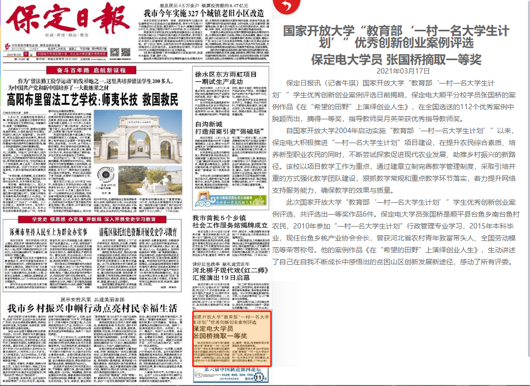 3月17日,《保定日报》头版报道我校学员张国桥摘取国家开放大学一等奖