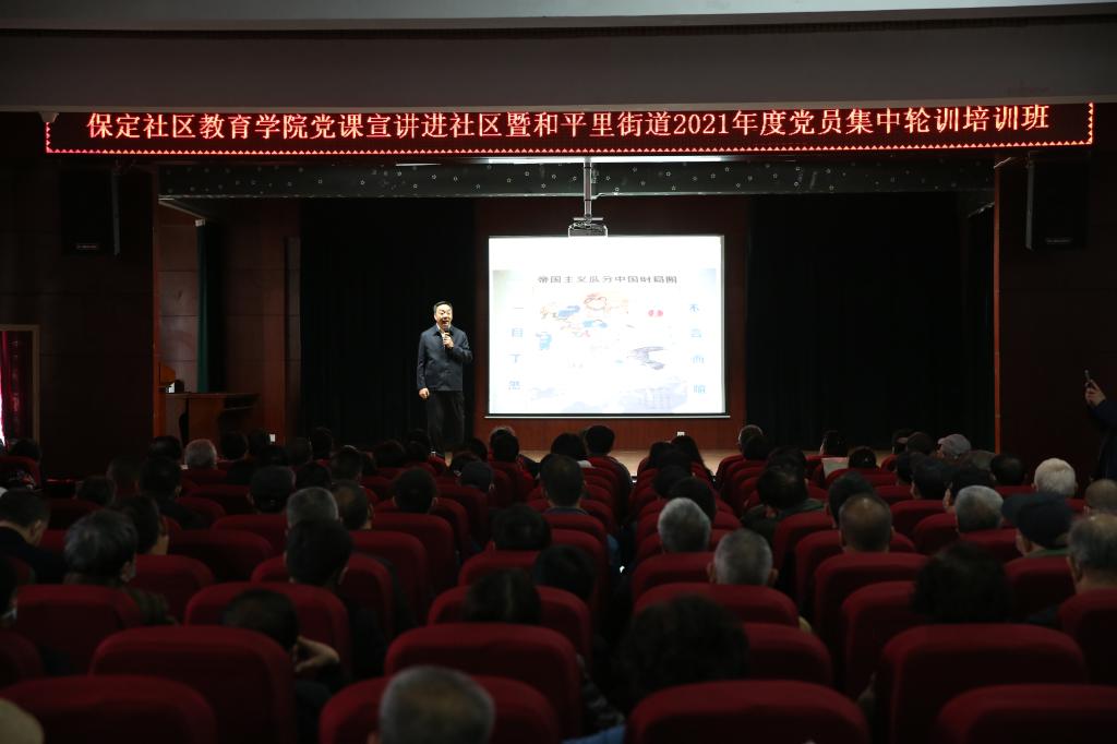 4月15日,保定社区教育学院“党课宣讲进社区”走进和平里街道办事处,在河北建筑工程学校会议厅为街道办的党员做培训宣讲。原保定职业技术学院院长赵沛,我校党委书记周贵斌、副校长赵国华,莲池区委常委、区武装部政委崔国青,和平里街道党工委书记田雅娟,街道党工委组织机关党支部党员和各社区支部、老干部支部共计约250名党员参加活动。