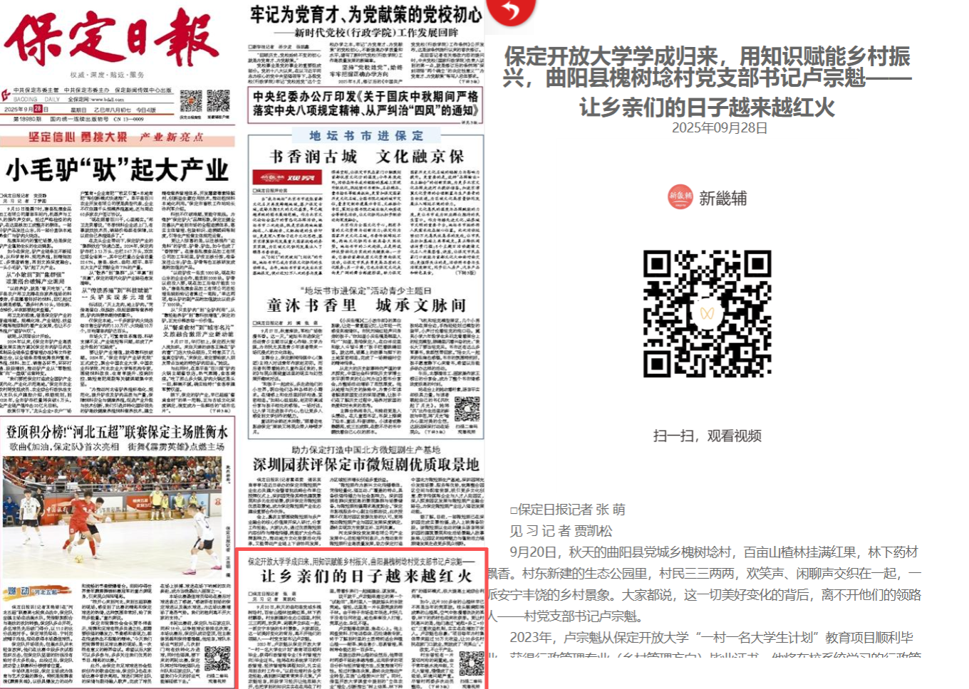 《保定日报》对我校“一村一名大学生计划”工作成果进行报道