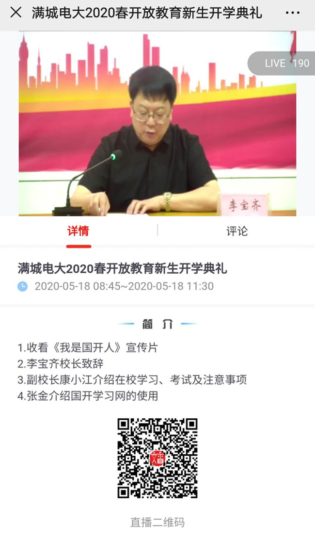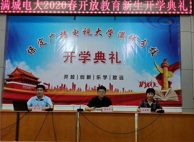 5月18日,满城电大采用线上直播形式,召开2020年春季开学典礼。满城电大校长李宝齐、副校长康小江及2020春季班主任参加现场典礼,副校长朱喜爱主持典礼。全体教职工和2020年春季新学员共计300余人收看