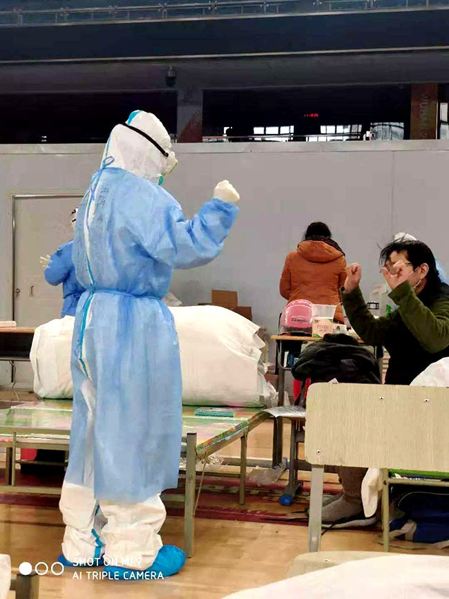 王会影到达武汉后,被分配到洪山体育馆方舱医院,这里是收治新冠肺炎患者的定点医疗机构,她每天负责测量分管病人的脉搏、呼吸、血压,掌握患者的病情动态。在隔离区,为了方便开展医疗和临床护理工作,她把耳边的长发剃光,这样可以降低感染风险,同时也可以避免出汗滋生细菌。