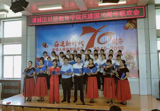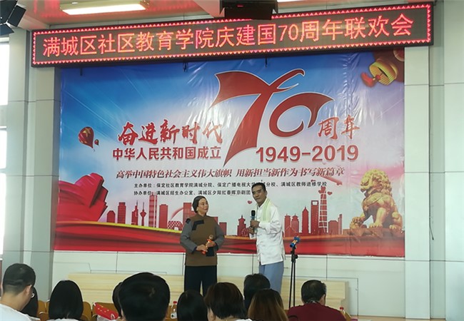 9月25日上午,满城社区教育学院携手满城区招办、满城区夕阳红春晖京剧团共同举办“欢庆祖国七十华诞”联欢会。满城区老年协会副会长、满城区原教育局局长、满城区原进修学校校长应邀观看了演出。满城电大全体教职工、满城区教育局招生办公室共100余人参加了此次联欢会。