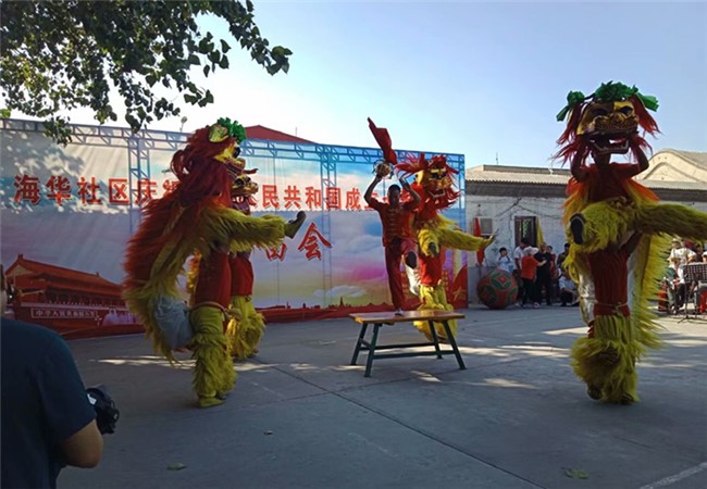 演出节目以历史发展背景为线索分为站起来、富起来、强起来三个篇章,演出内容丰富多彩、形式多样。一首首歌颂祖国和党的歌曲让人心潮澎湃,一支支精心准备的舞蹈让人感受着丰收的喜悦,其中前来助演的中国非物质文化遗产传人商凯方带来的节目金狮狂舞,让社区居民在家门口就看到了曾登上过央视春晚舞台的狮子舞,演出现场高潮迭起,精彩纷呈,深受社区居民的欢迎。