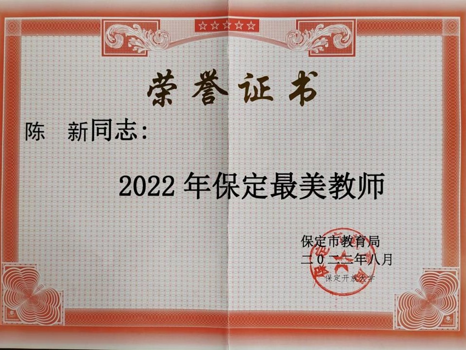 近日,保定市教育局公布2022年“保定最美教师”名单,我校陈新老师荣获“保定最美教师”荣誉称号。陈新老师长期担任我校工商管理专业的专业主持教师,负责讲授的课程多次获省市级奖项,获得了师生的广泛好评。今年5月,由陈新老师参与指导的“蜗牛漫步——中国人工智能教育的深耕者”项目,在中国国际“互联网+”大学生创新创业活动中荣获河北开放大学金奖,充分向社会展示了开大人勤...